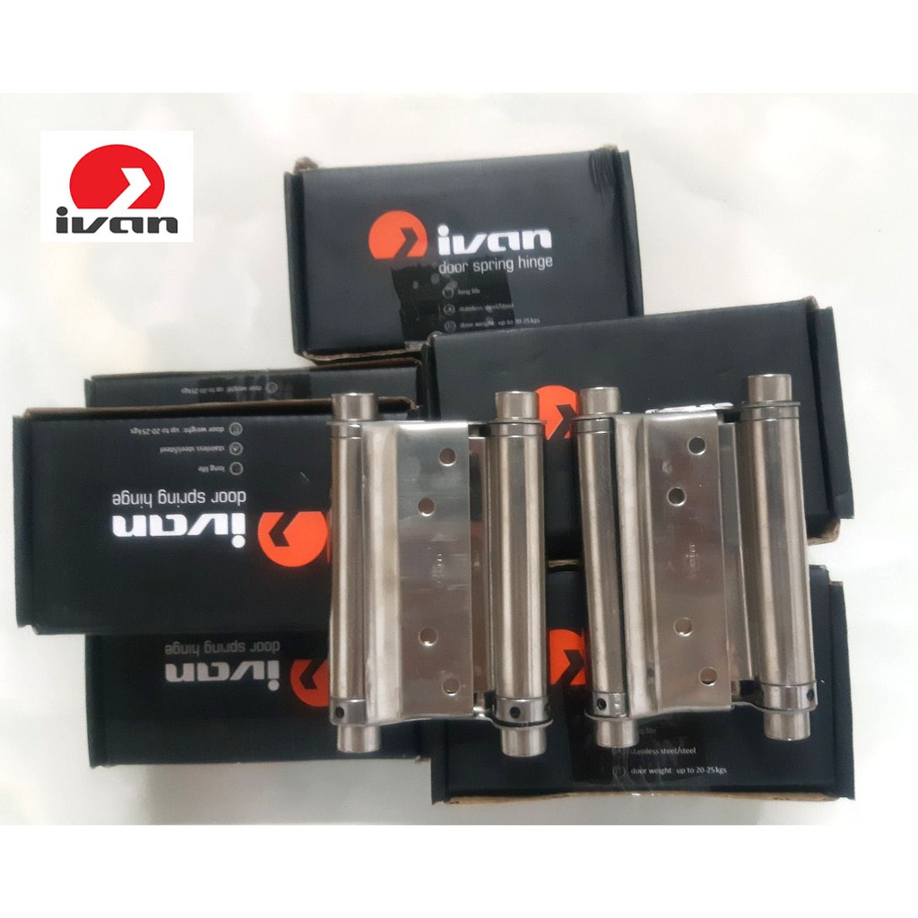 Bản lề cửa 2 chiều inox Ivan sản xuất từ inox không rỉ, sử dụng cho cửa đóng mở 2 chiều, chịu được trọng lượng cửa từ 20 - 25 kg.