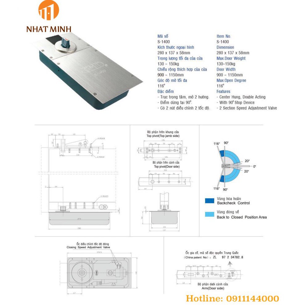 Nội dung Bản lề sàn GMT S1400 loại nặngChiều rộng cửa thích hợp 900 - 1150mm