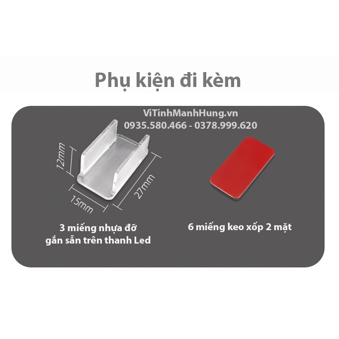 - Phụ kiện đi kèm: 3 miếng nhựa giữ thanh led ( gắn sẵn ) + 6 miếng keo xốp 2 mặt.
