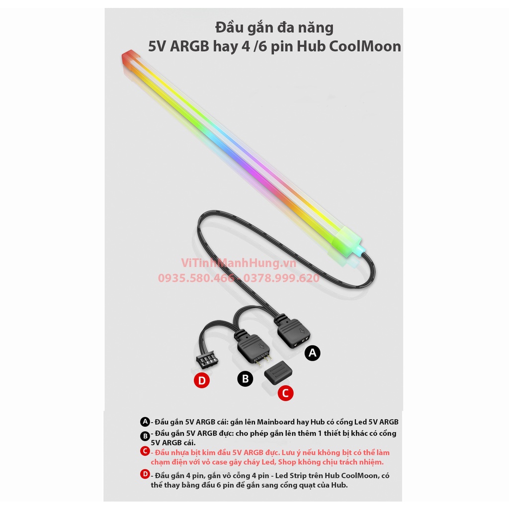 - Đầu gắn Led đa năng, có thể gắn lên cổng led 5V ARGB trên Mainboard và Hub hỗ trợ hay cổng 4 pin hoặc 6 pin trên Hub CoolMoon.