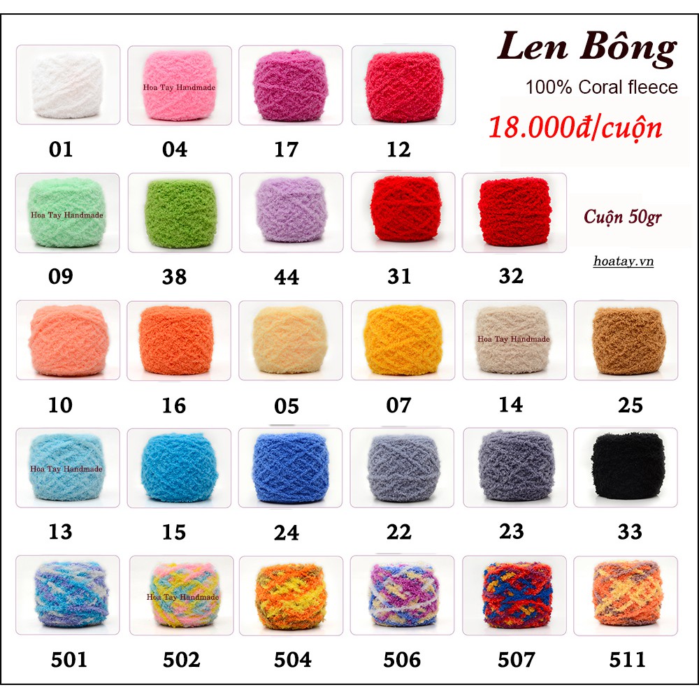Len bông là loại len rất mịn, cỡ sợi to vừa và màu sắc đa dạng. Thích hợp đan móc các sản phẩm như khăn, áo, nón, ...