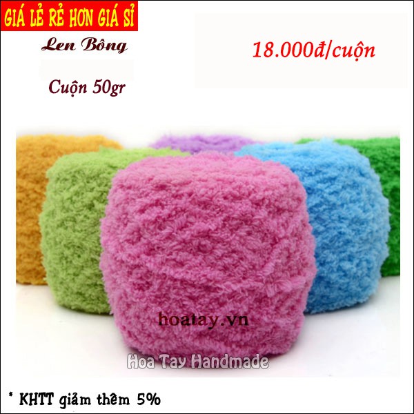 Len bông là loại len rất mịn, cỡ sợi to vừa và màu sắc đa dạng. Thích hợp đan móc các sản phẩm như khăn, áo, nón, ...