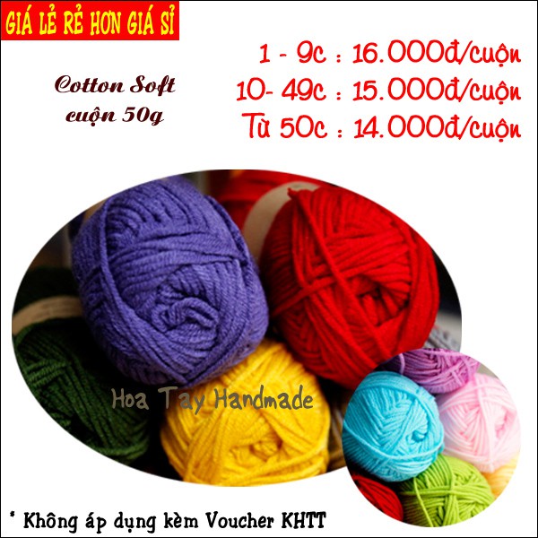 Len Cotton Soft. Sợi mềm, tròn, mịn, xốp nhiều màu sắc đa dạng. Thích hợp hầu hết các sản phẩm đan móc.Dùng kim móc cỡ 2.5 -3mm, Kim đan cỡ 4- 4.5mm