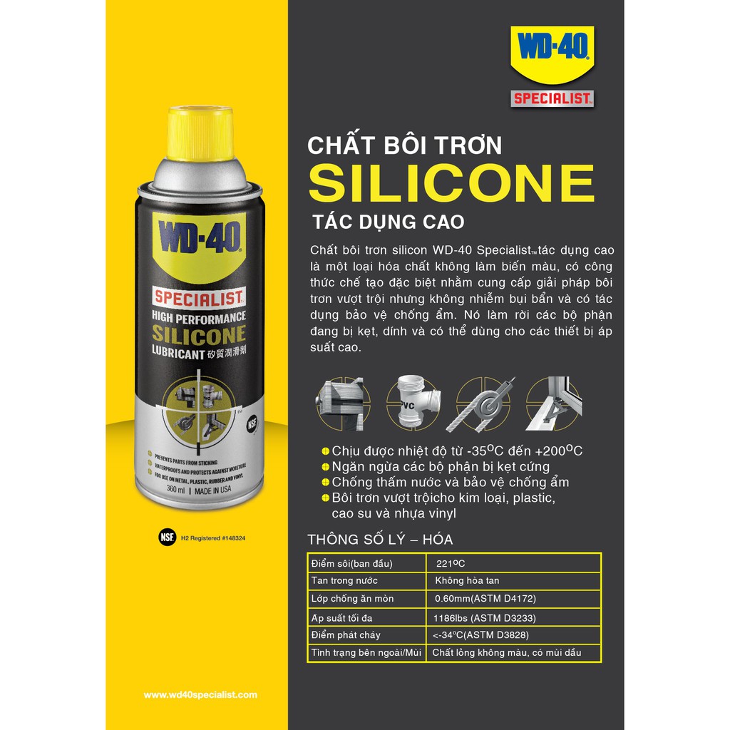 [ LÊN DÙNG] Chai Chất Bôi trơn Silicon, tác dụng cao WD-40 Specialist Food Grade 360mlYAMEAUTO666 chuyên phân phối sản phẩm Chất Bôi trơn Silicon, tác dụng cao WD-40 Specialist Food Grade 360ml là loại hóa chất không làm biến màu, có công thức chế tạo đặc biệt nhằm cung cấp giải pháp bôi trơn vượt trội mà không nhiểm bụi bẩn và còn có tác dụng bảo vệ chống ẩm.
