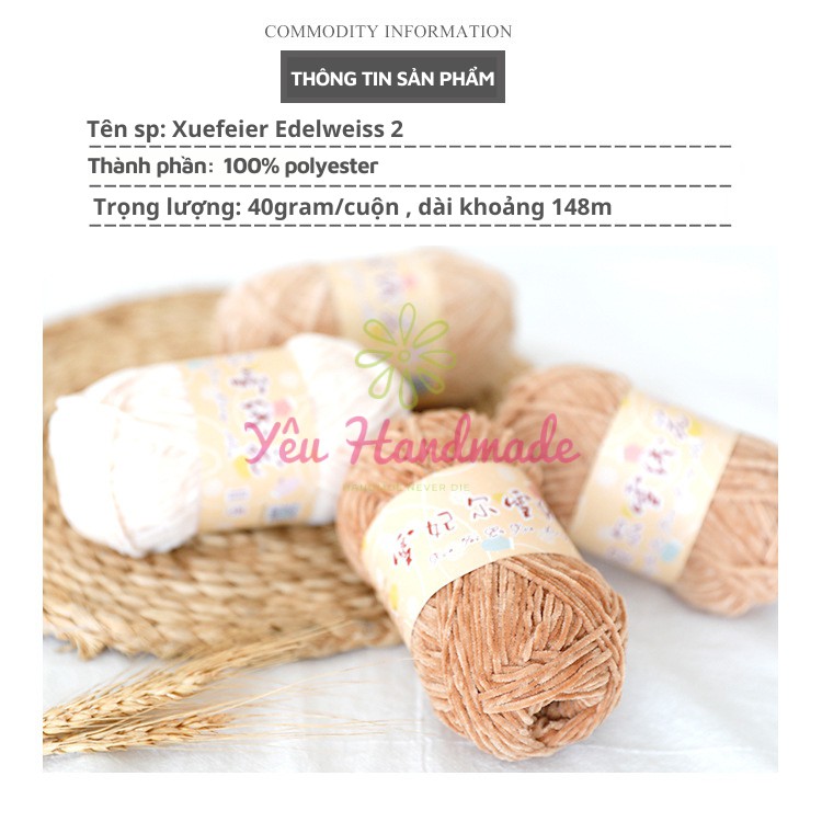 Len nhung 2mm - Len nhung Xuefeier Edelweiss NO 2 - Len nhung chenille 2mm mềm mịn, không rụng lông - YeuhandmadeLen nhung 2mm Xuefeier NO 2 là dòng len nhung 2mm móc thú thịnh hành và được yêu thích ở nội địa Trung. Phiên bản NO 2 là cải tiến từ phiên bản NO 1 với sợi len mềm mịn, mướt hơn, sờ không thích shop trả lại tiền ngay.