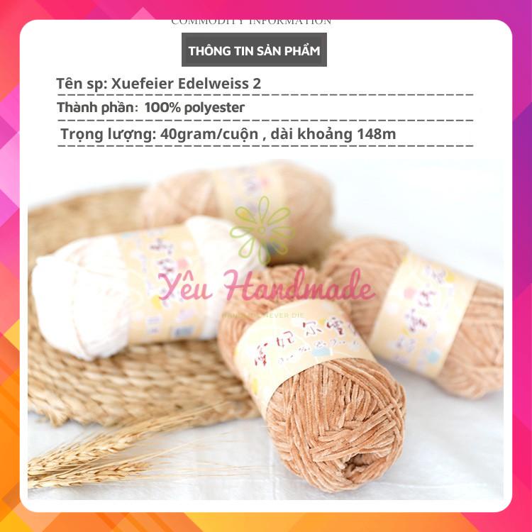 Len nhung 2mm - Len nhung Xuefeier Edelweiss NO 2 - Len nhung móc thú mềm mịn, không rụng lông - YeuhandmadeLen nhung Xuefeier 2mm NO 2 là dòng len nhung 2mm móc thú thịnh hành và được yêu thích ở nội địa Trung. Phiên bản NO 2 là cải tiến từ phiên bản NO 1 với sợi len mềm mịn, mướt hơn, sờ không thích shop trả lại tiền ngay.