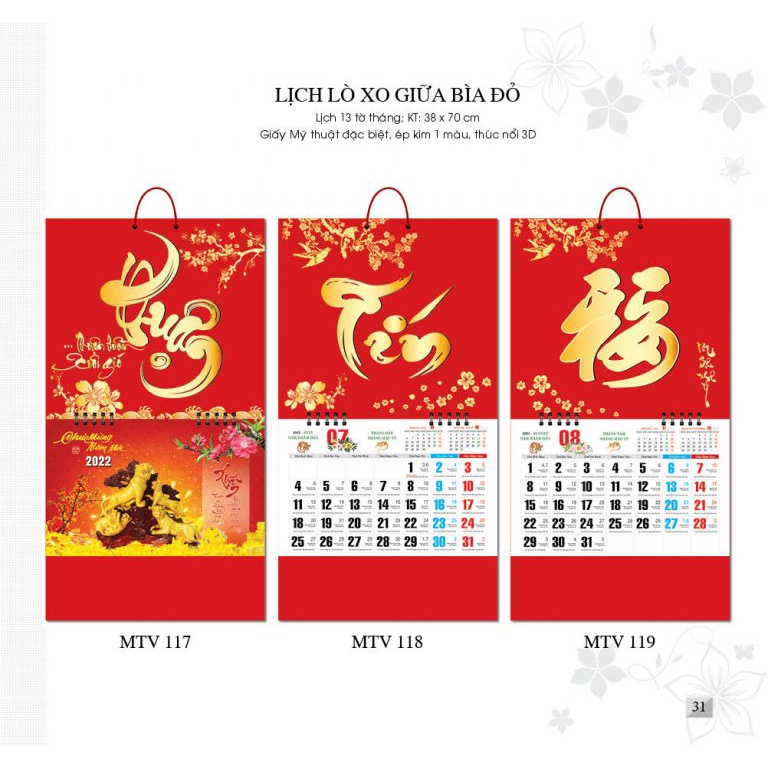 Giới thiệu Lịch tết 2022, lò xo giữa, lịch âm dương treo tường 12 tờ, Kích thước cả bìa 38x70cm mỗi tháng là 1 tờ