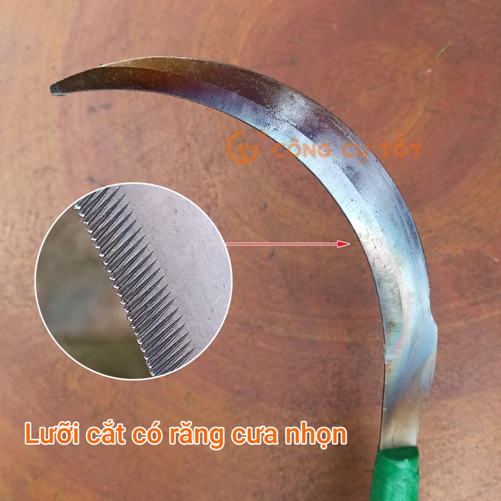 Lưỡi liềm rèn từ vật liệu 9 thép bền bỉ, có răng cưa nhọn và sắc bén, đem lại hiệu quả cắt caoTay cầm làm bằng nhựa tiêu chuẩn theo phương pháp đúc và ép nóng, không bị sút, mẻ
