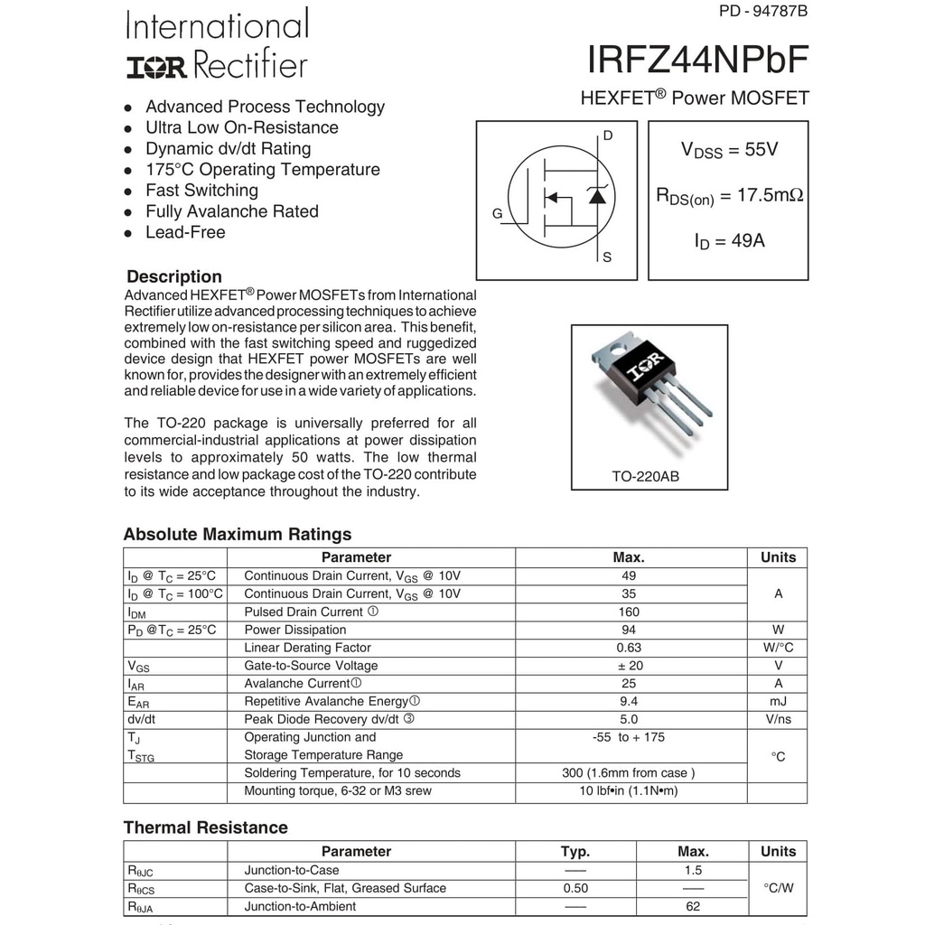 Giới thiệu LINH KIỆN Bán Dẫn - MOSFET - IRFZ44NPBF IRFZ44N 49A/55V