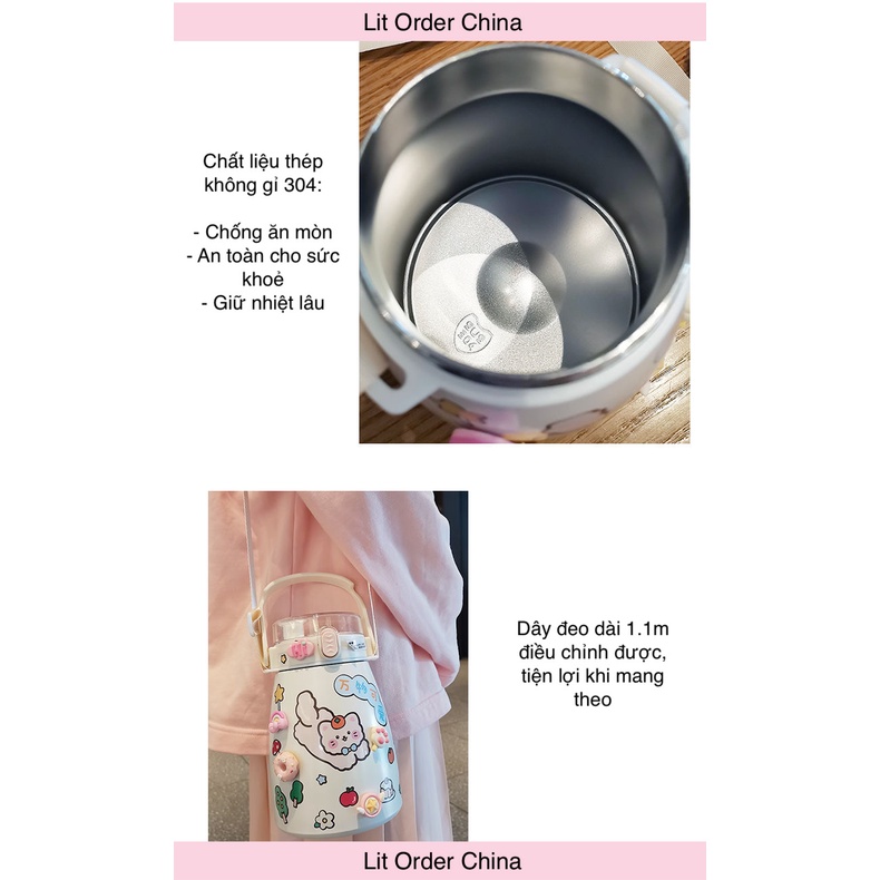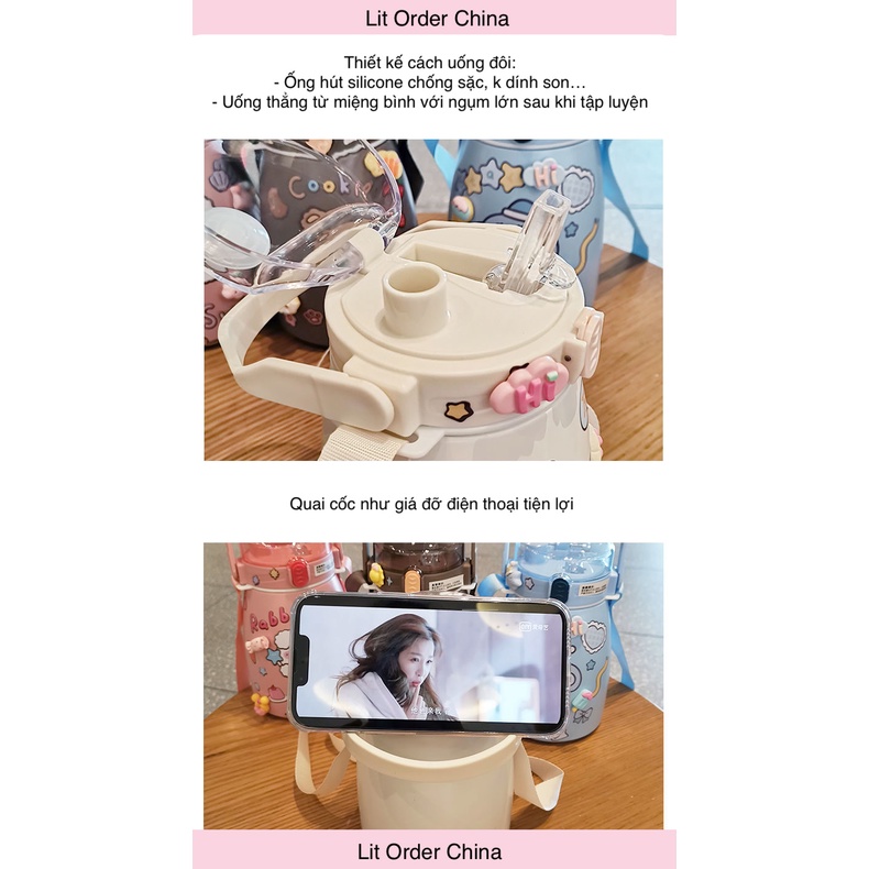 Giới thiệu LIT Bình giữ nhiệt cute full sticker 2D 3D kèm quai đeo dung tích 900ml