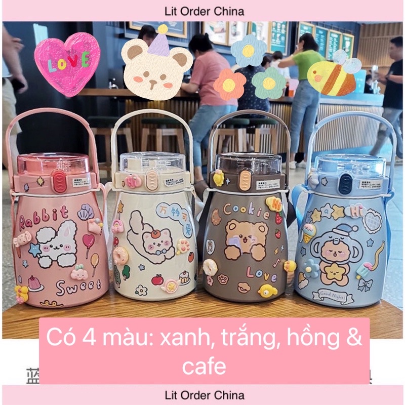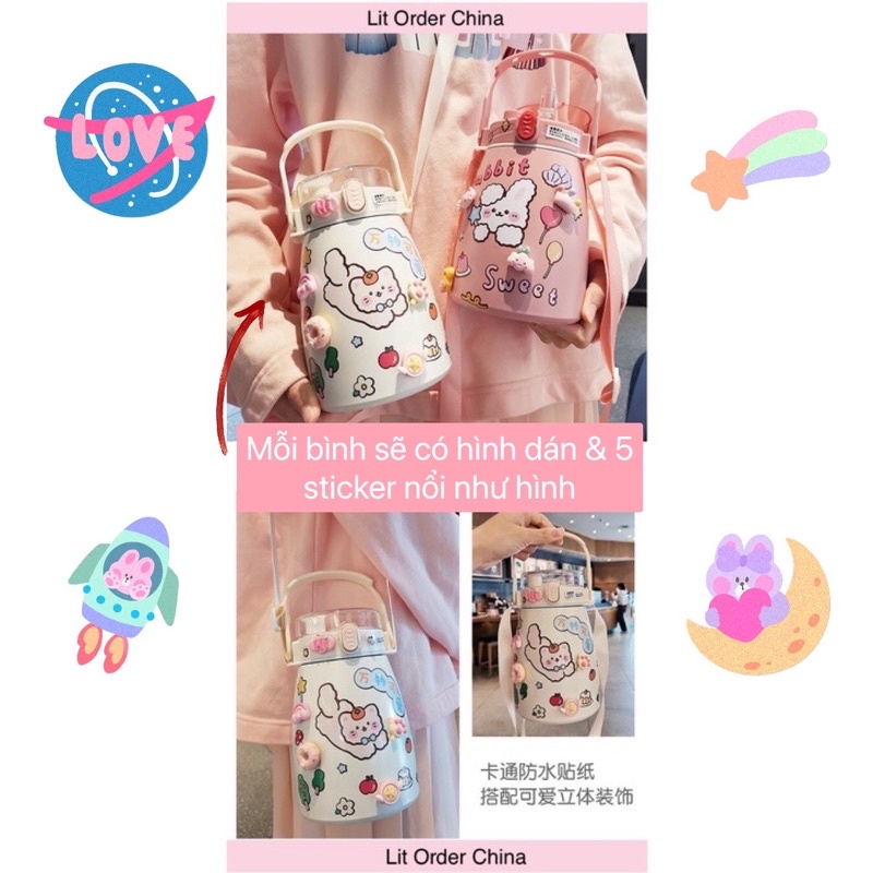 Nhà cửa & Đời sống > Bộ đồ bàn ăn > Bình nước & phụ kiện || LIT Bình giữ nhiệt cute full sticker 2D 3D kèm quai đeo dung tích 900mlCòn hàng