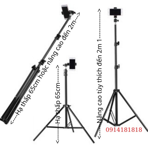 chân đế đỡ điện thoại livestream cao từ 65cm đến 2m, Bạn có thể điều chỉnh độ cao thấp từ 70cm cao đến 2m, có thể livestream bán sản phẩm của mình một cách thoải mái nhất.