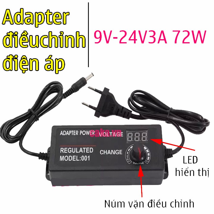 Adapter điều chỉnh điện áp 9-24V 3A là Nguồn Adapter điều chỉnh điện áp AC-DC có hiển thị có hiển thị đèn led báo Volt đang ở mức điện áp bao nhiêu. Nguồn Adapter điều chỉnh điện áp AC-DC .Có thiết kế nhỏ gọn, chắc chắn, thường được sử dụng để cấp nguồn, test sản phẩm: Motor, board mạch điện,Nguồn Adapter điều chỉnh điện áp AC-DC còn có biến trở chỉnh áp linh hoạt dải điện áp trong mục đích nhu cầu sử dụng dễ hàng quan sát mức điện áp...Thông số kỹ thuật: Adapter điều chỉnh điện áp 9-24V 3A