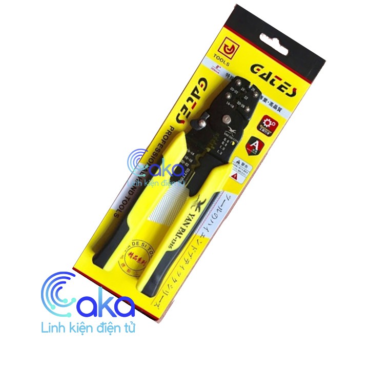 - Kìm tuốt dây đa năng Gates được làm bằng chất liệu thép cứng, cán được bọc nhựa cao cấp, chống trượt, mang cảm giác thoải mái khi sử dụng. Kìm đa năng có thể tuốt và cắt dây: 0.6-1.3mm2, bấm Cos: 0-14; 16-18; 20-22; 14-18; 20-22; 22-26; 22; 28mm2.