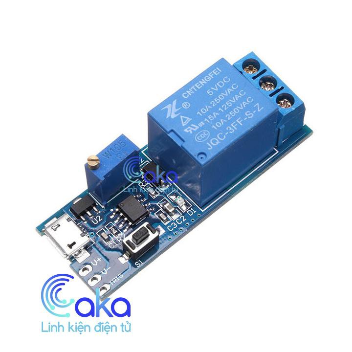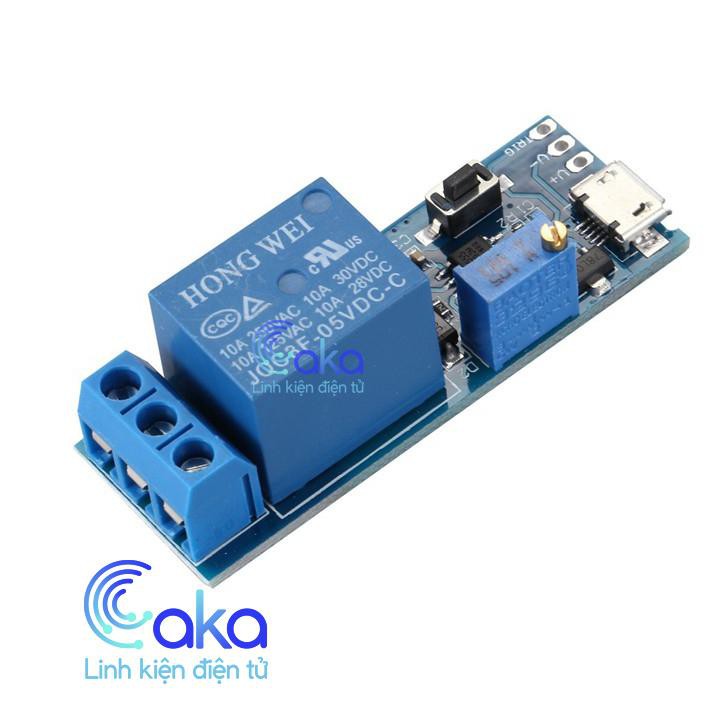 Mạch tạo trễ đóng ngắt relay 0~24sMạch tạo trễ đóng ngắt relay 0~24s có chức năng đóng relay sau khi kích hoạt nút nhấn, thời gian đóng relay có thể điều chỉnh từ 0 ~ 24 giây bằng chiết áp tích hợp trên mạch, sau khi kết thúc thời gian mạch ngắt relay trở về trạng thái ban đầu và chờ lệnh kích tiếp theo.