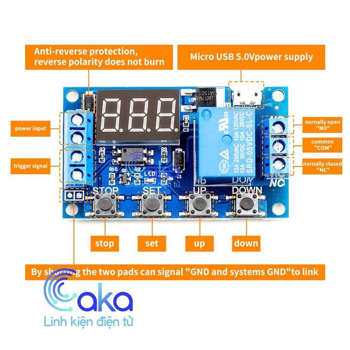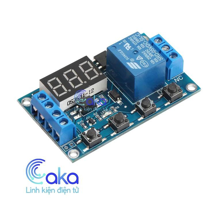 Mạch tạo trễ đóng ngắt theo chu kỳ thời gian thựcMạch tạo trễ đóng ngắt theo chu kỳ. Mạch có chức năng cài đặt thời gian hoạt động theo chu kì với thời gian có thể cài đặt từ 0.1 giây đến 999 phút cho 1 lần ON, từ 0.1 giây đến 999 phút cho 1 lần OFF và từ 1 đến 999 chu kì đếm hoặc có thể cài đặt vòng lặp vô hạn.
