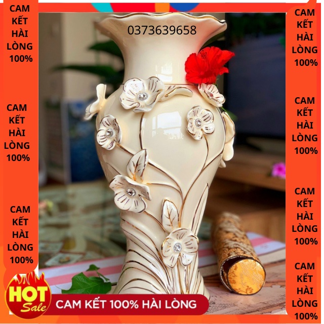 Họa tiết hoa 3d nổi vẽ vàng cổ điển nhung vô cùng sang trọng . Nước men gốm sứ trắng phau biểu tượng của sự mới mẻ, thuần khiết. Sự giao hoa gặp gỡ của hai biểu tượng cũ và mới đã tạo nên sức hấp dẫn tuyệt vời của chiếc bình gốm sứ cao cấp.