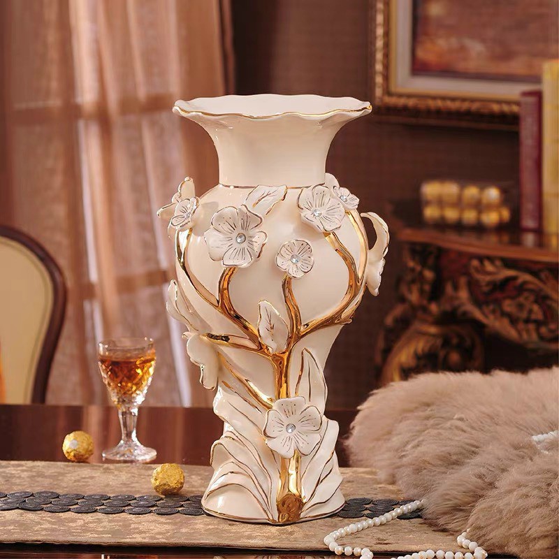 Nhà cửa & Đời sống > Trang trí nhà cửa > Bình trang trí || Lọ Cắm Hoa Gốm Sứ Vẽ Vàng Họa Tiết Hoa 3D Nổi -Bình Cắm Bông Men Sứ Trắng Cao Cấp Hàng Nhập Khẩu Kt 19* 39 cmCòn hàng