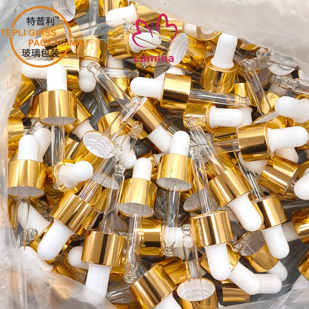 Nắp: đầu bóp cao su màu trắng, khoen kim loại vàng một sọc bạc, ống hút thủy tinh