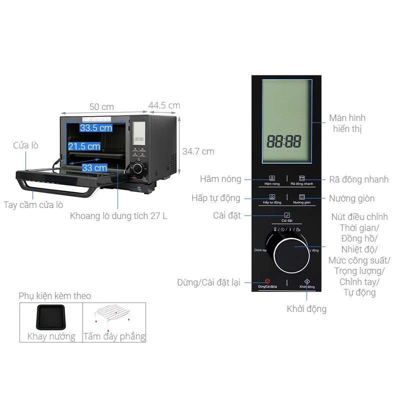 - Tiện ích: Hẹn giờ nấu, Khoang lò có đèn, Cửa kính gương sang trọng, Khoá bảng điều khiển tự động, Làm sạch bằng hơi nước, Lò không dùng đĩa xoay, Inverter tiết kiệm điện