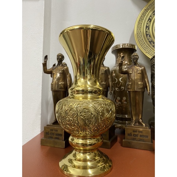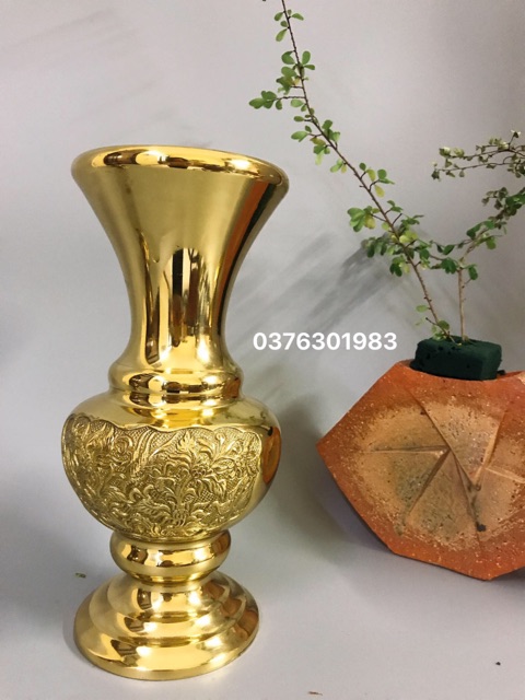 ✔ Lọ hoa bằng đồng vàng nguyên chất 100%, cao 30cm, được phủ màu sáng bóng giúp sản phẩm k bị xỉn màu, màu sắc bền đẹp mãi với thời gian.
