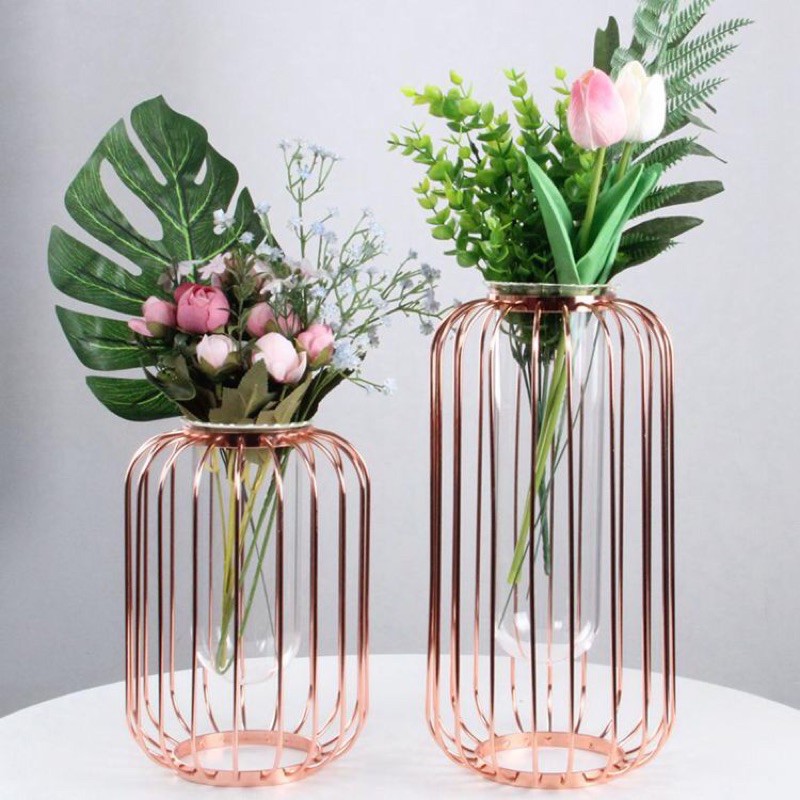 Lọ hoa 2 lớp dáng lồng chim có phần lõi trong là thủy tinh dùng để cắm hoa, phần bọc ngoài là kim loại màu vàng hồng, tạo dáng như hình lồng chim rất độc đáo, lạ mắt.