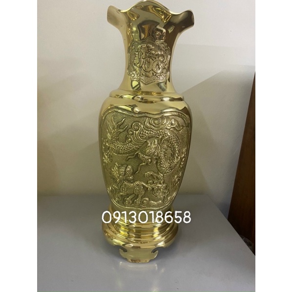Sản phẩm là một lọ hoa bằng đồng nguyên chất cao 40cm đúc nổi hoạ tiết tứ linh long lân quy phượng tỉ mỉ rõ nét như hình:Lọ cao 39cm nặng 4,5kg /1 lọ