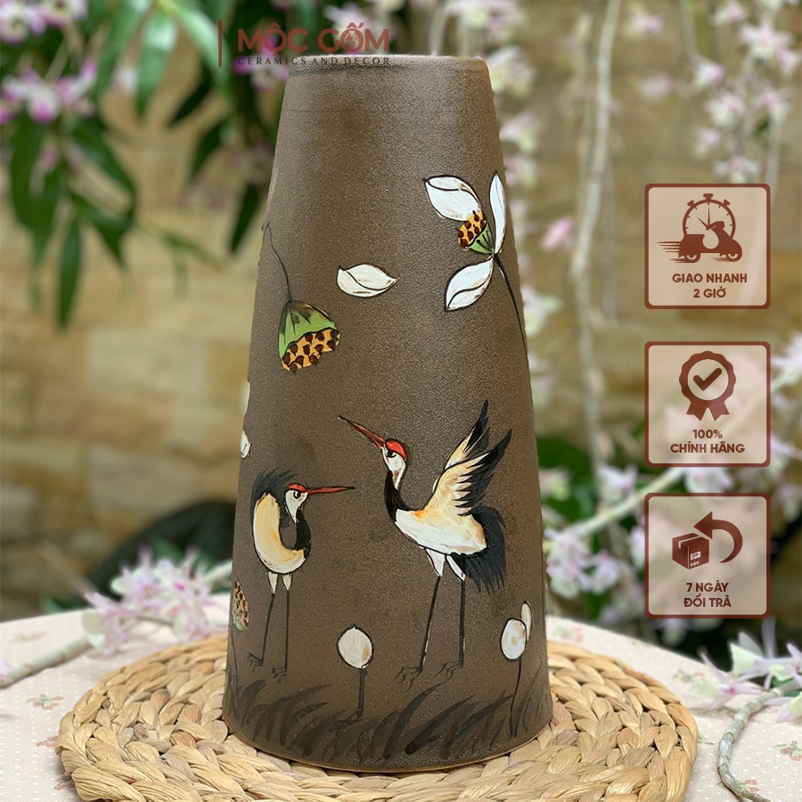 Nhà cửa & Đời sống > Trang trí nhà cửa > Bình trang trí || Lọ hoa gốm Bát Tràng họa tiết chim hạc bên hoa sen - bình hoa dáng ống khói | Mộc Gốm MG97Còn hàng