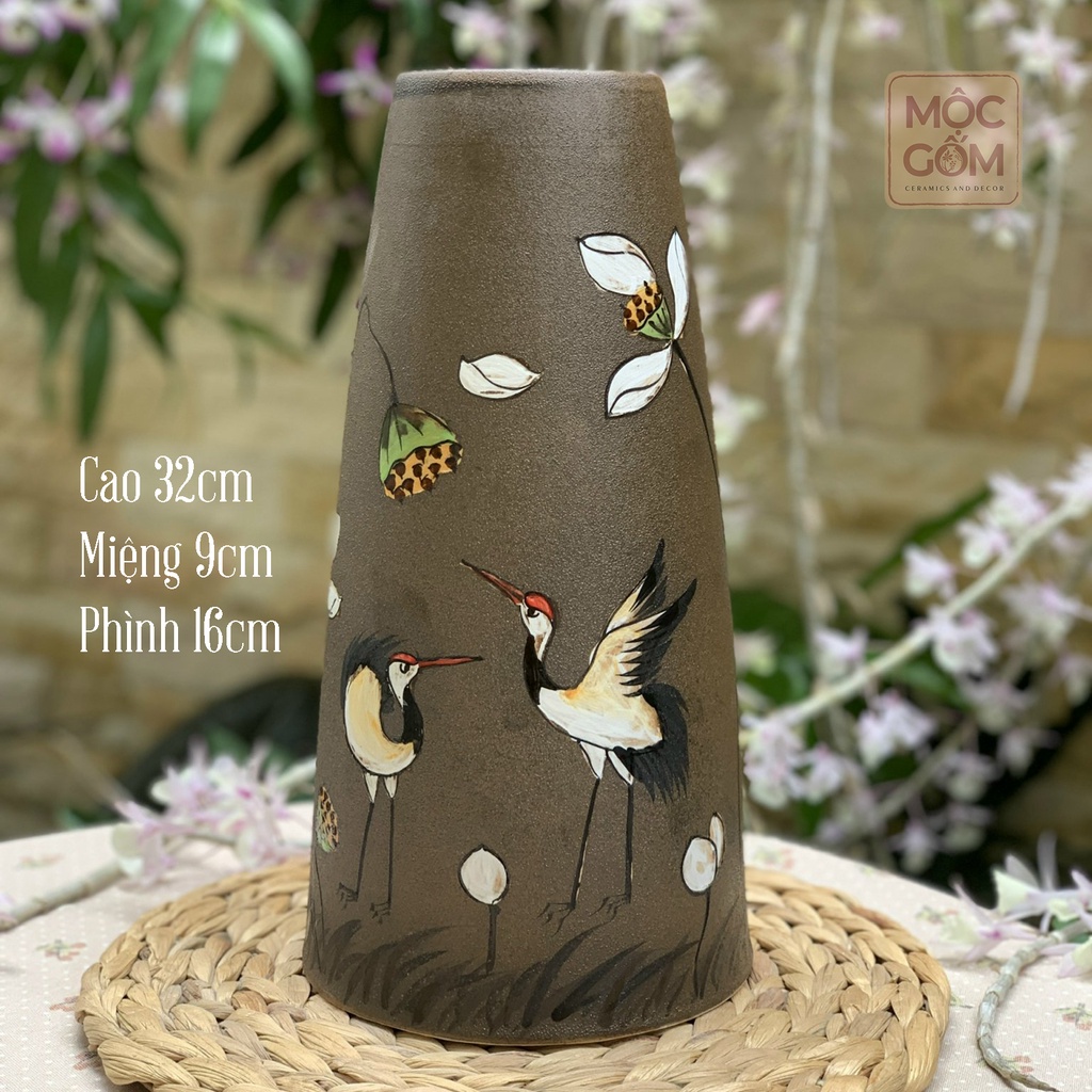 Lọ hoa gốm Bát Tràng họa tiết chim hạc bên hoa sen - bình hoa dáng ống khói | Mộc Gốm MG97