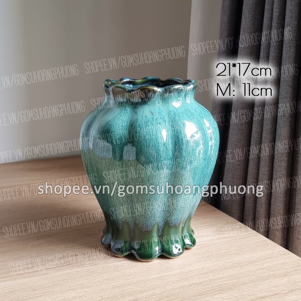 Lọ hoa gốm sứ men hỏa biến dáng miệng hoa Bát Tràng (KHÔNG KÈM HOA)* Mô tả sản phẩm: Sứ Bát Tràng, men hỏa biến, tráng men trong ngoài. Dòng men hỏa biến sẽ có sự thay đổi về sắc độ theo nhiệt độ đun nên mỗi sản phẩm làm ra sẽ có sự chênh lệch về độ sáng/tối và đường vân trên lọ. Do đó mỗi sản phẩm làm ra sẽ là độc nhất vô nhị. Đồng thời dưới ánh sáng khác nhau sản phẩm cũng sẽ có sự khác biệt về màu sắc ạ. Quý khách vui lòng chú ý giúp shop ạ.