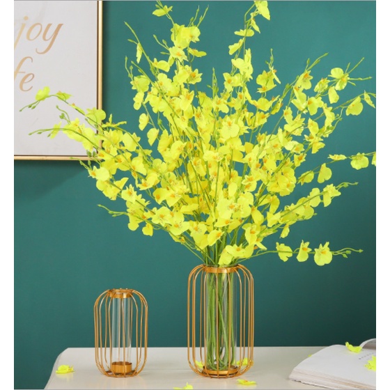 - Chất liệu: Khung kim loại phun sơn tĩnh điện vàng, hũ cắm hoa màu hổ phách nhạt