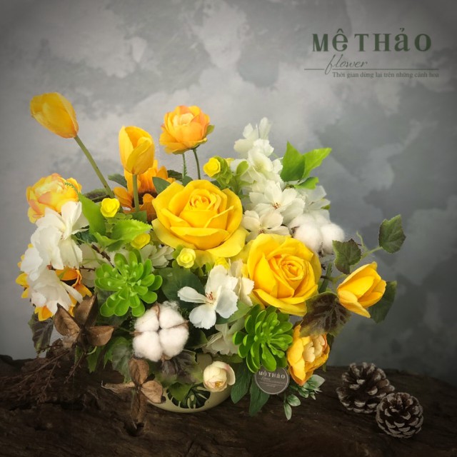 Lọ Hoa Hồng Vàng Mix Phong Cách Vintage Chất Liệu Lụa Cao Cấp Trang Trí Phòng Khách Của Mê Thảo Flower