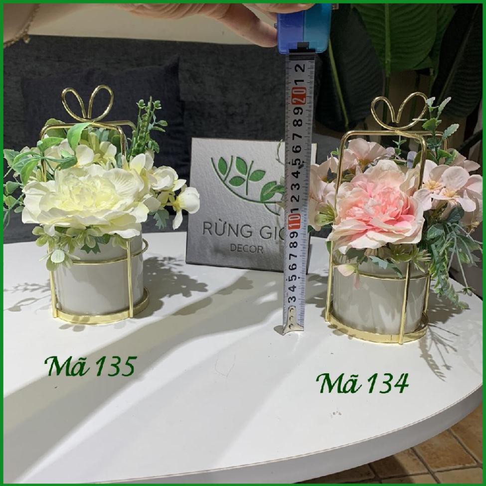 Mã 135: lọ sứ trắng viền kim loại + hoa màu hồng , cao 27cm tính từ đáy lọ đến viền đầu đỉnh nơ kim loại, giá 180k