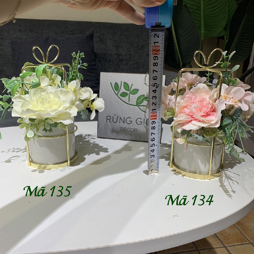 Mã 134: lọ sứ trắng viền kim loại + hoa màu vàng , cao 20cm tính từ đáy lọ đến viền đầu đỉnh nơ kim loại, giá 180k