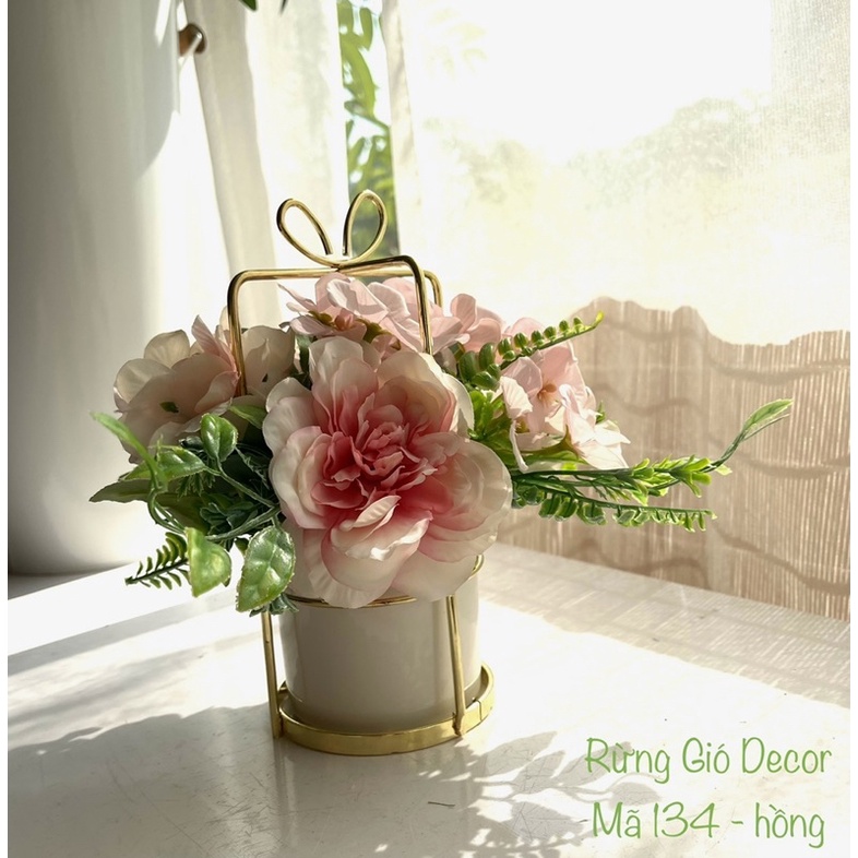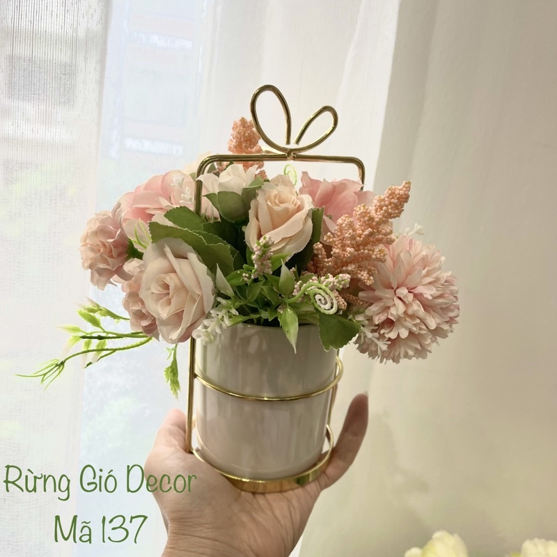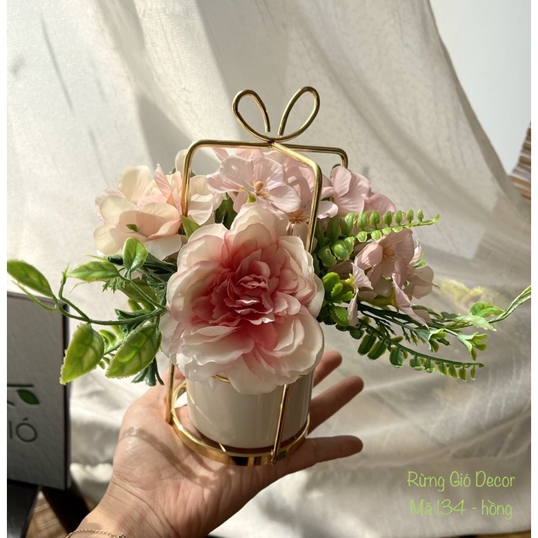 Mã 135: lọ sứ trắng viền kim loại + hoa màu hồng , cao 27cm tính từ đáy lọ đến viền đầu đỉnh nơ kim loại, giá 180k