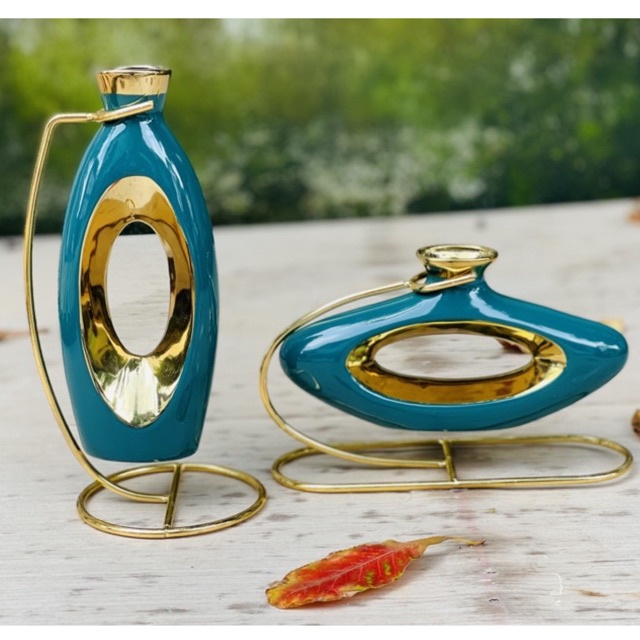 - Bộ đôi lọ hoa treo với kiểu dáng,thiết kế mới lạ,bắt mắt,màu xanh bắc âu kết hợp viền vàng ánh kim sang trọng,đem đến một nét tươi mới tôn thêm vẻ đẹp của bất kì loài hoa nào khi kết hợp với nó- Bộ sp gồm 2 bình,2 giá treo