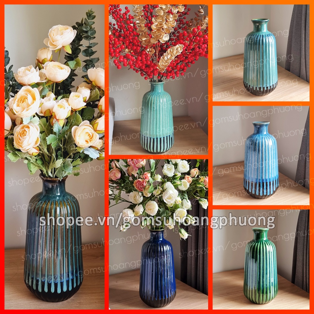Bình hoa gốm sứ cao 34cm thích hợp cắm cành lựu, thông, tuyết mai, cỏ lau, lông công,...* Mô tả sản phẩm: Sứ Bát Tràng, tráng men trong ngoài. Dòng men hỏa biến sẽ có sự thay đổi về sắc độ theo nhiệt độ đun nên mỗi sản phẩm làm ra sẽ có sự chênh lệch về độ sáng/tối và đường vân trên lọ. Do đó mỗi sản phẩm làm ra sẽ là độc nhất vô nhị. Đồng thời dưới ánh sáng khác nhau sản phẩm cũng sẽ có sự khác biệt về màu sắc ạ. Quý khách vui lòng chú ý giúp shop ạ.