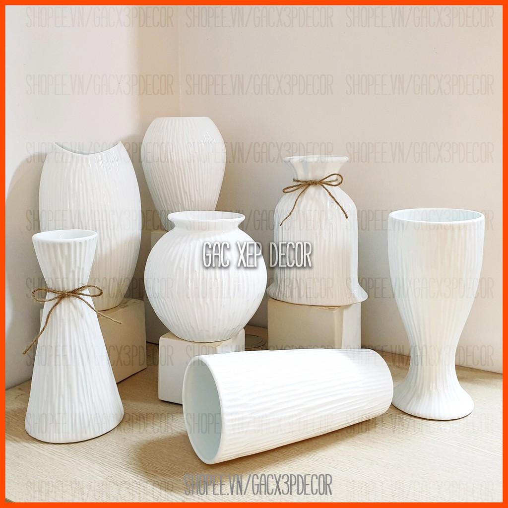 Lọ hoa sứ trắng ganh dọc phong cách Bắc Âu* Chất liệu: Sứ sương/thấu quang Bát Tràng, tráng men trong ngoài, không kèm dây nơ