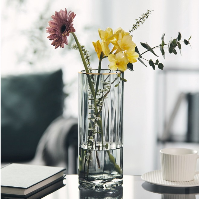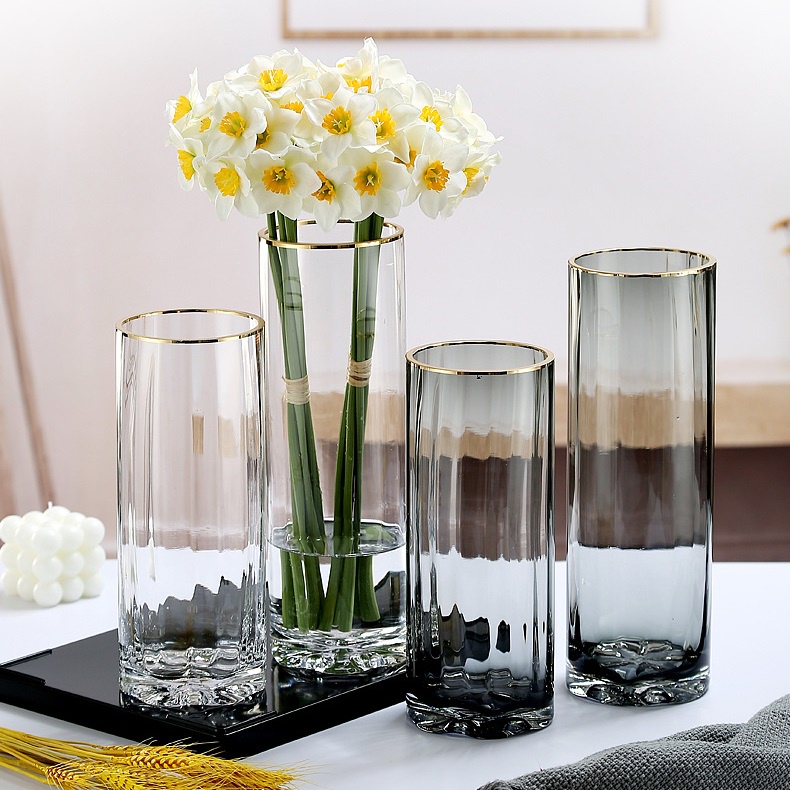 Lọ hoa thuỷ tinh bình hoa cao cấp trang trí nhà cửa kiểu dáng hình trụ viền miệng vàng - Daisy.decor - Hàng có sẵn