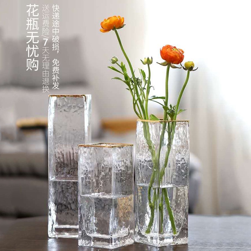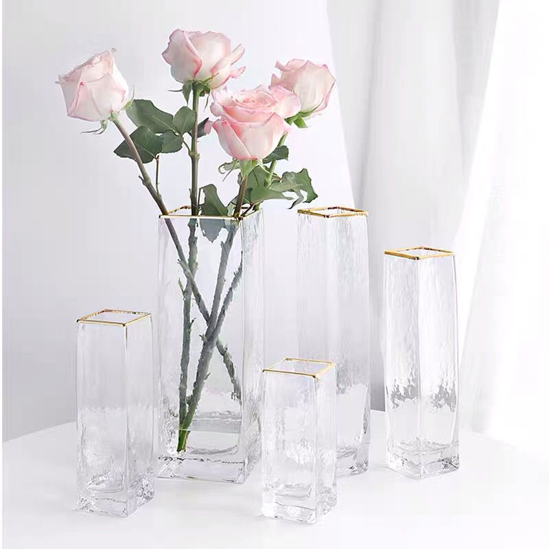 Lọ hoa thủy tinh hình trụ vuông, miệng viền vàng sang trọng, cao 25 cm, chuyên cắm hoa, trồng cây thủy sinhLọ hoa thủy tinh