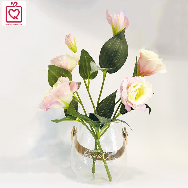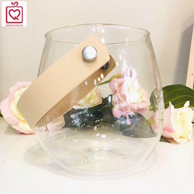 - Lọ hoa độc đáo bởi thiết kế dáng bầu, miệng lọ rộng và quai xách da tiện lợi, thủy tinh trong suốt tựa như pha lê.