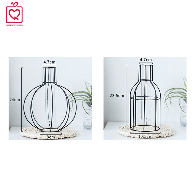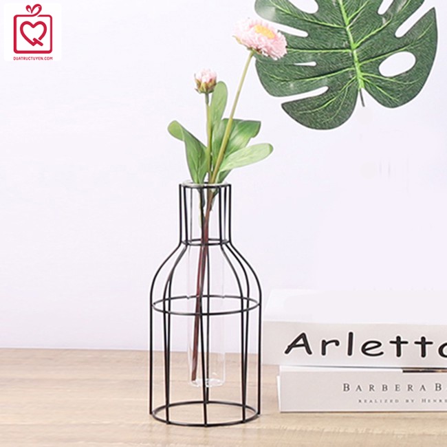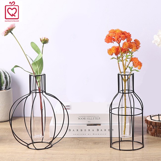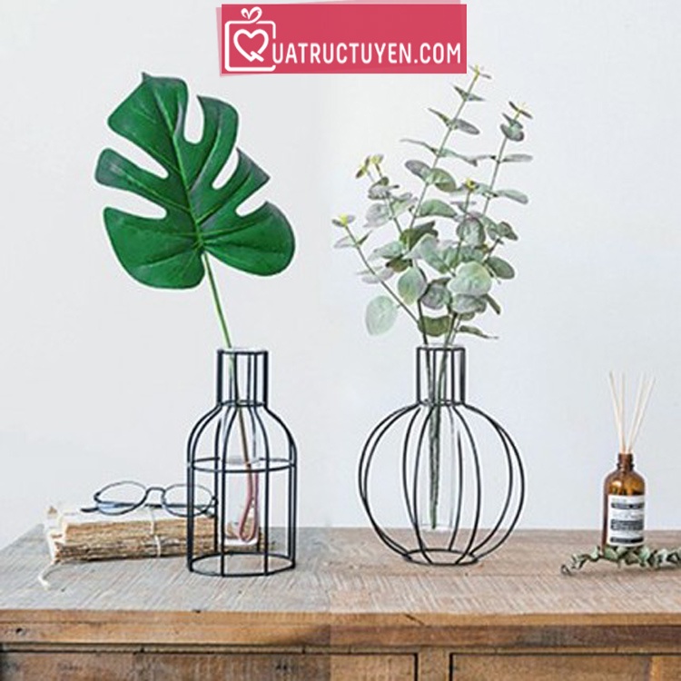 Lọ hoa thủy tinh khung sắt trang trí nhà cửa, quán cafe độc đáo, bình cắm hoa khung sắt