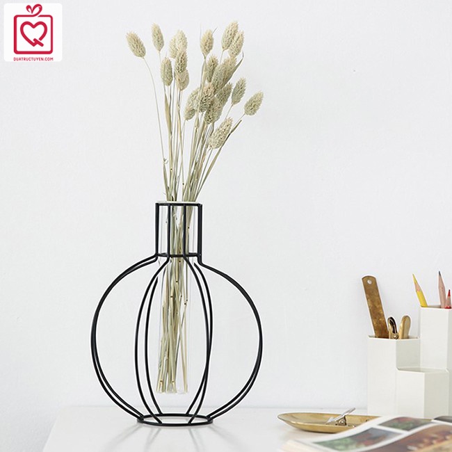 - Lọ hoa dáng trụ giống ống nghiệm thủy tinh, phần miệng khá dày và được đỡ bởi giá sắt. Bạn cũng có thể tháo lọ hoa ra khỏi khung sắt để thay nước hoặc rửa vệ sinh.