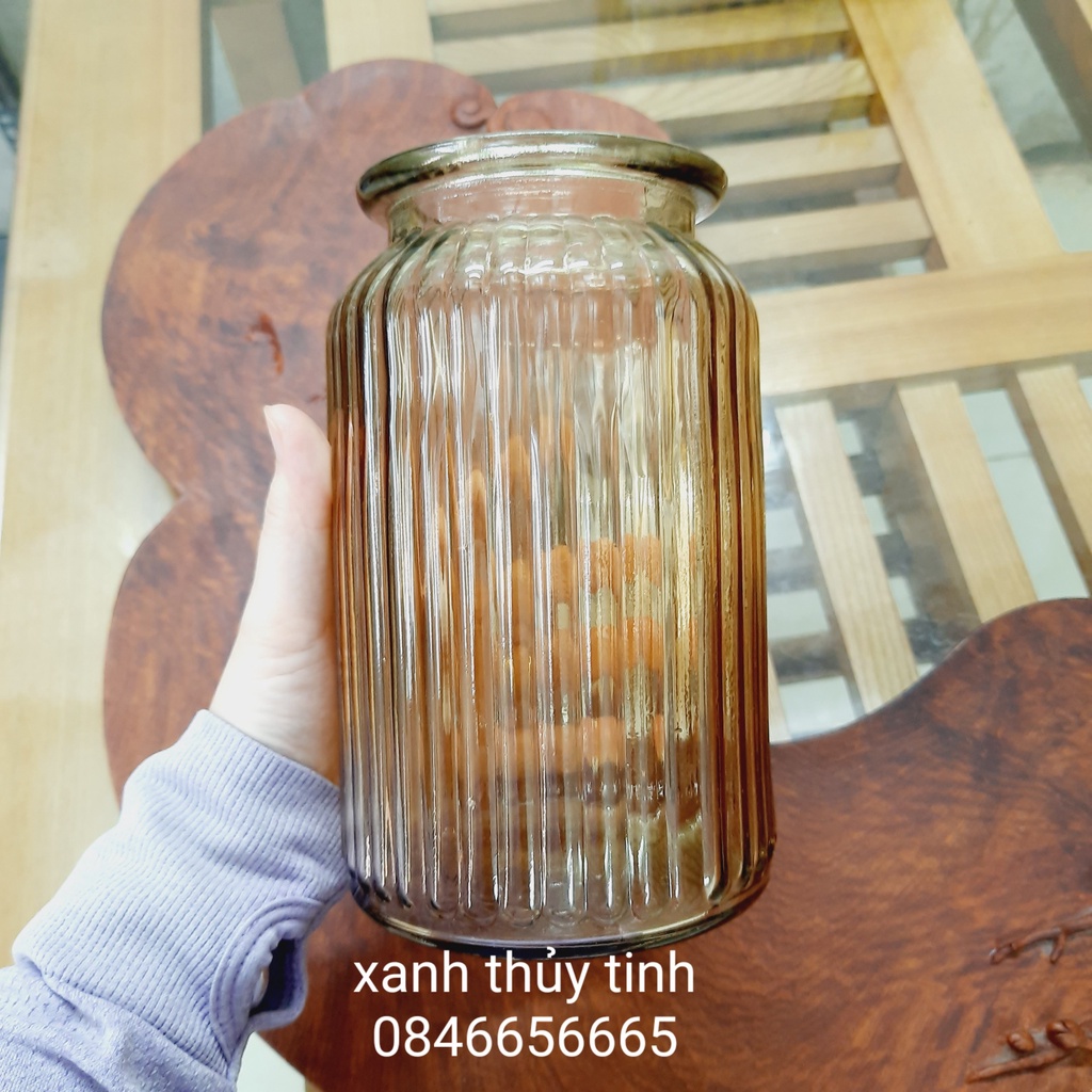 Lọ hoa thủy tinh màu hổ phách, phong các pha lê vintage, lọ dáng trụ sọc cao 18cm