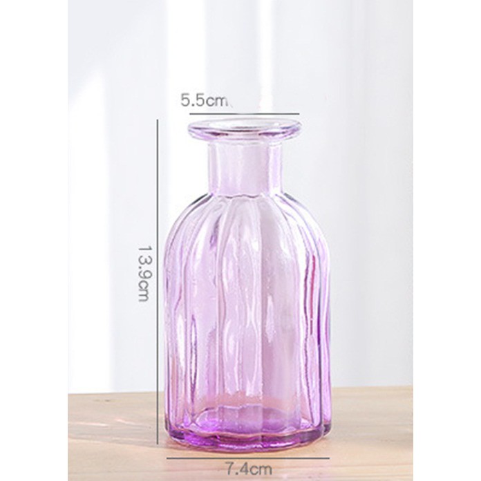 Lọ hoa thủy tinh nhỏ vân sọc nổi với miệng thu nhỏ. Bạn có thể quấn thêm dây thừng gai hay ruy băng làm nơ ở phần miệng lọ để tạo thêm điểm nhấn.Kích thước: miệng 5cm, bình 7x14cm.