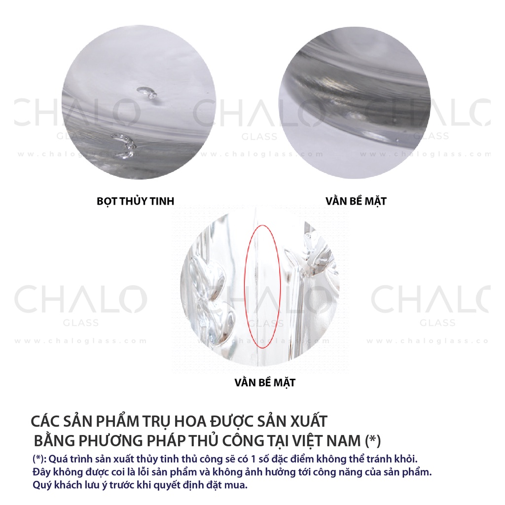 Do sản phẩm được sản xuất thủ công nên sẽ có bọt thủy tinh. Đây là đặc điểm không thể tránh khỏi trong quá trình thổi thủy tinh thủ công. Quý khách vui lòng cân nhắc kỹ trước khi mua.