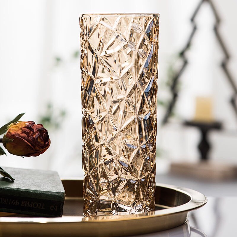 Lọ hoa thuỷ tinh cao cấp vân chéo Huydecor mới về .Lọ hoa thuỷ tinh có mầu hổ phách nhạt .