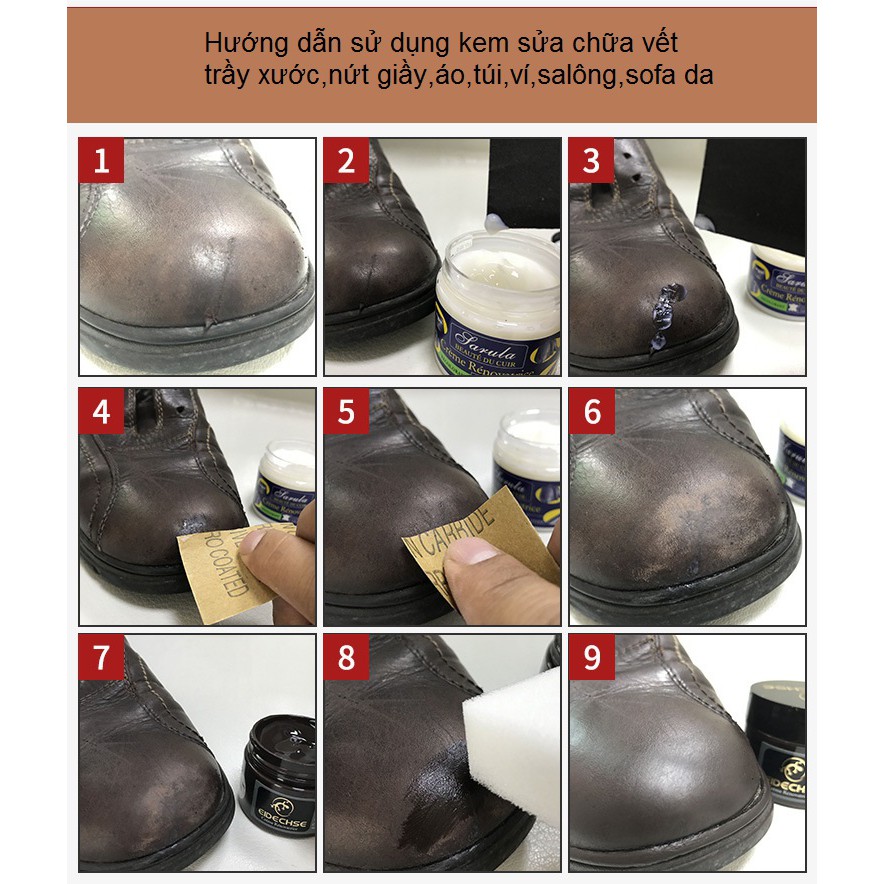 Lọ keo mềm chuyên dụng để sửa chữa khi đồ da của bạn bị bong tróc,nứt nẻ,trầy xước . Lọ kem mềm có tác dụng lấp đầy các kẽ nứt da,và ngăn các vết nứt vết bong tróc tiếp tục phát triển.