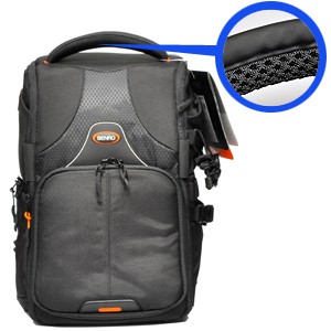 - Mặt lưng túi có thiết kế đặc biệt với các múi - gờ thông gió có chiều cao đủ để có lượng thoáng gió tốt. Nhưng chất liệu của các gờ này là rất nhẹ và đủ độ vững để bảo đảm định hình của khung balô và bảo vệ các thiết bị đựng bên trong.