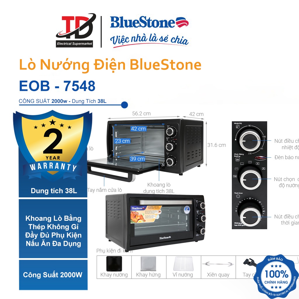 Lò nướng Bluestone EOB-7548 38 lít thương hiệu uy tín, lò nướng tốt, chất lượng, nướng thức ăn ngon được nhiều người tin dùng.